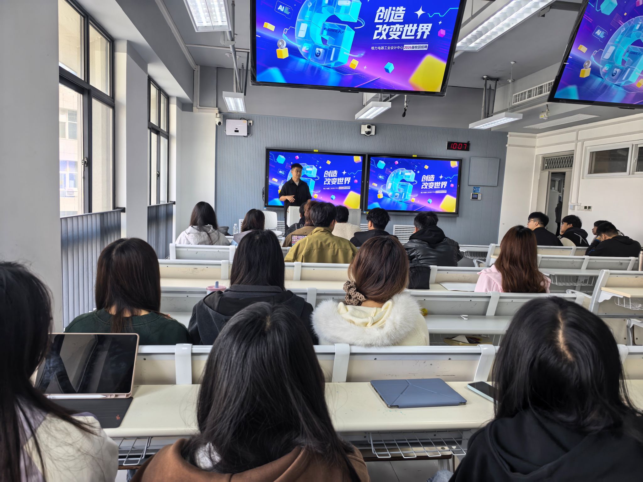 在教7-305开展格力电器专场招聘宣讲会。本次招聘会由公司HR何江主持。