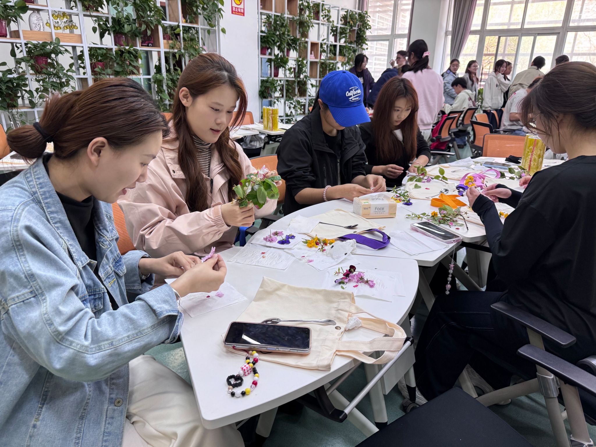 动手创作环节,同学们在工作人员一对一耐心指导下,精心挑选新鲜的树叶、雏菊、艾草等兼具清明节气特色的植物,巧妙搭配布局,通过敲击、固色、定型等一系列操作,将自然植物的纹理与色彩永久定格在素色布料上,制作出独一无二的植物拓染帆布包、书签等作品。