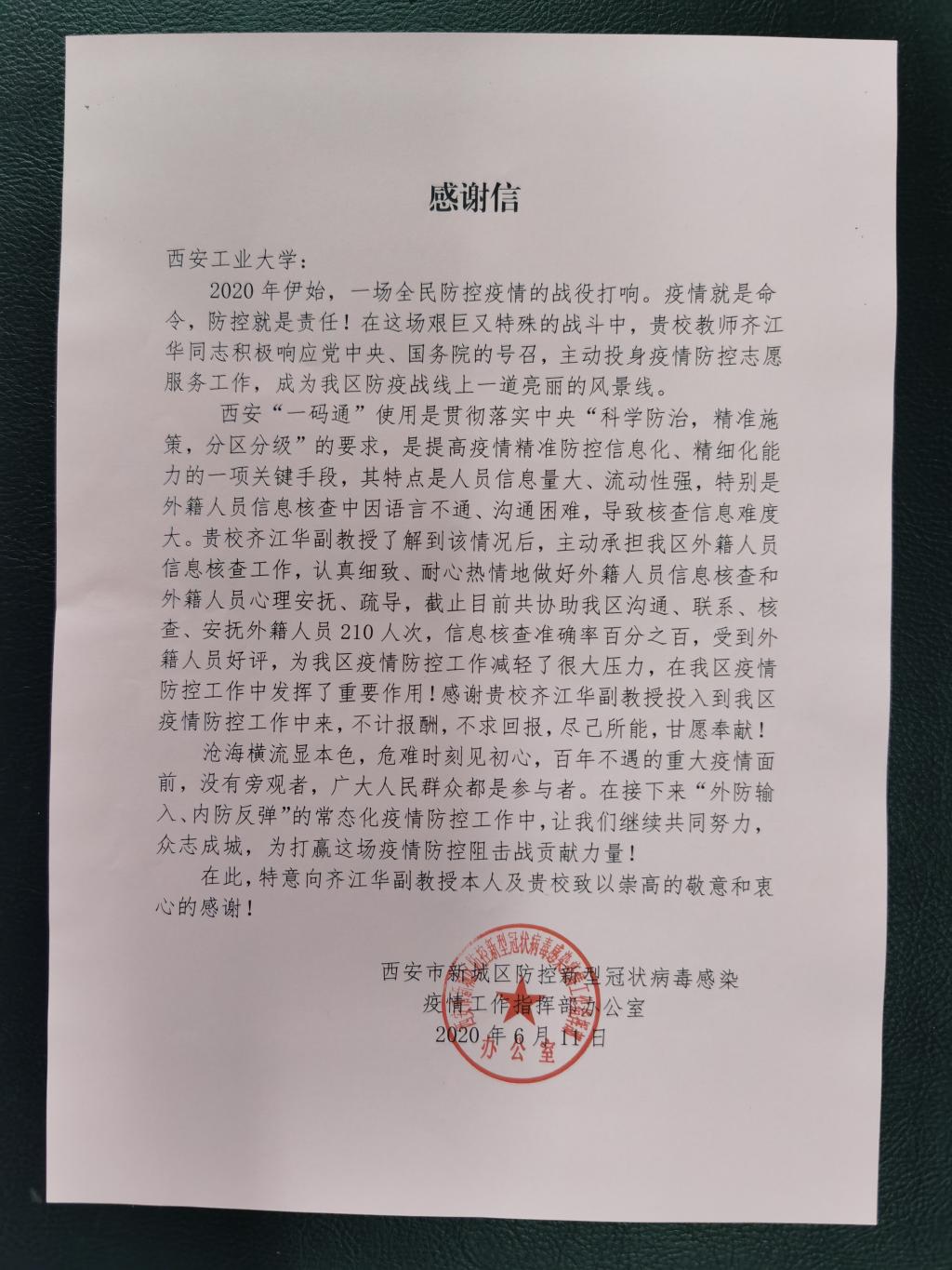 信中说到,全国上下众志成城抗击新冠肺炎疫情的关键时期,西安“一码通”使用是贯彻落实中央“科学防治,精准施策,分区分级”的要求,是提高疫情精准防控信息化、精细化能力的一项关键手段,其特点是人员信息量大、流动性强,特别是外籍人员信息核查中因语言不通、沟通困难,导致核查信息难度大。齐江华副教授了解到该情况后,主动承担了新城区外籍人员信息核查工作,认真细致、耐心热情地做好外籍人员信息核查和外籍人员心理安抚、疏导,共协助新城区沟通、联系、核查、安抚外籍人员210人次,信息核查准确率百分之百,受到外籍人员好评,为新城区疫情防控工作减轻了很大压力,在新城区疫情防控工作中发挥了重要作用!齐江华老师在疫情核查工作中,不计报酬,不求回报,尽己所能,甘愿奉献!